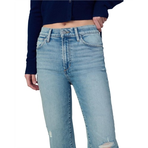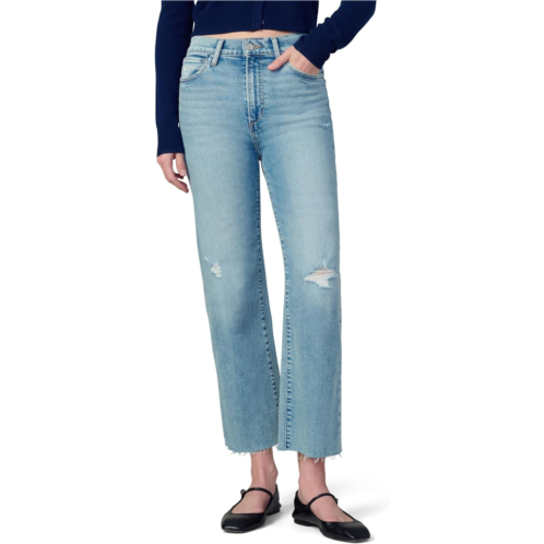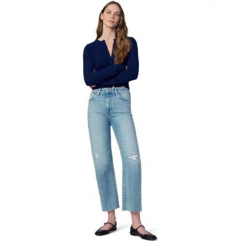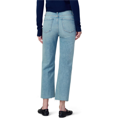 The Joe's Jeans The Blake Cropped Wide Leg With Cut Hem feature a fitted style, zip-fly, and button closure. The comfortable jeans have a slim fit through the waist and hips with a high-rise waist and a minimal wide-leg design that hits above the ankle.