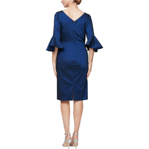 - Elegance blooms in the Alex Evenings Short Sheath Dress, a captivating creation that dazzles with a shoulder adorned in exquisite floral appliques. With 3/4 bell sleeves and a V-back with zippered closure, this short taffeta masterpiece exudes sophistication. A vision of perfection, this sheath dress is designed for those who appreciate unique and graceful style.