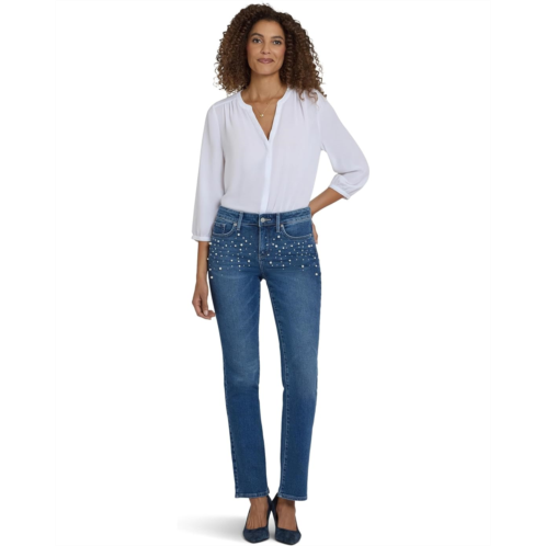 Your casual jeans just got a stylish update with the NYDJ Petite Marilyn Straight Jeans in Lake Notre-Dame. The curve-sculpting, figure-elongating construction of this jeans pairs well with everything, in a versatile straight-leg silhouette. This straight-leg style features a high-rise waist with belt loops, a zip-fly & button closure, a five-pocket design, and faux pearl & rhinestone embellishment on the front hips for a touch of glam. It is made with Lift Tuck Technology to flatten in the front and flatter curves in the back.