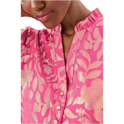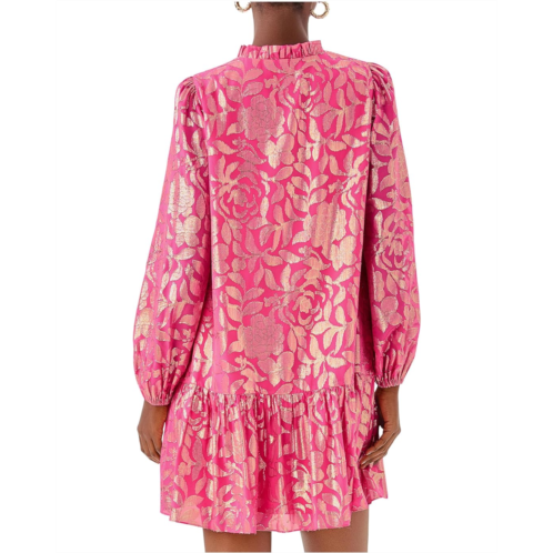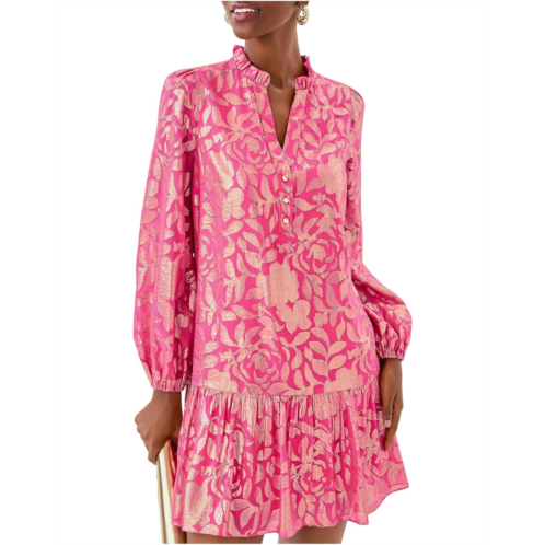 - Feel fabulous in this subtly gleaming Lilly Pulitzer Evaline Silk Dress. It features a ruffle neckline and a half placket adorned with rhinestone buttons, offering a hint of sparkle. The long sleeves with elastic cuffs provide a comfortable fit, while the hem ruffle adds a playful flair.