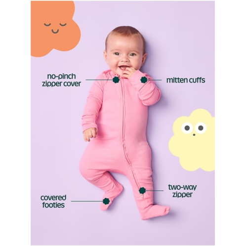 - Fold-over mittens at each sleeve flip over to keep baby’s hands warm and protect tender skin from scratches. Genius!