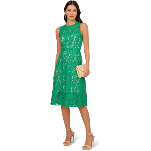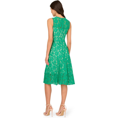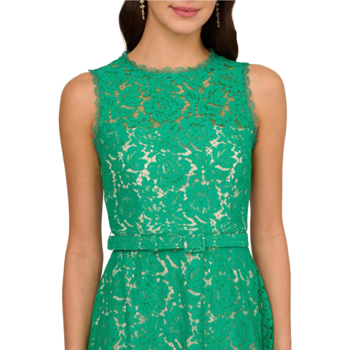 Dressy by day, flirty by night, this lace dress is a charming look. This fit and flare dress features a crew neckline, sleeveless bodice with sheer lace at the yoke, and a belted waist. Partially-lined with contrasting fabric, this midi dress is crafted from lace that is sheer at the neck and hem. This party dress is closed with a zipper at the center back. Complete the look for a day at the office or a night out with nude heels and sparkling jewels.