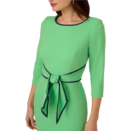 The Adrianna Papell Tipped Crepe Tie Dress is a modern, easy sheath in soft knit crepe, designed in an elegant midi length and accented with three quarter length sleeves, a streamlined skirt and ultra-flattering tie waist. Love the subtle tipping at the neckline and waist tie.