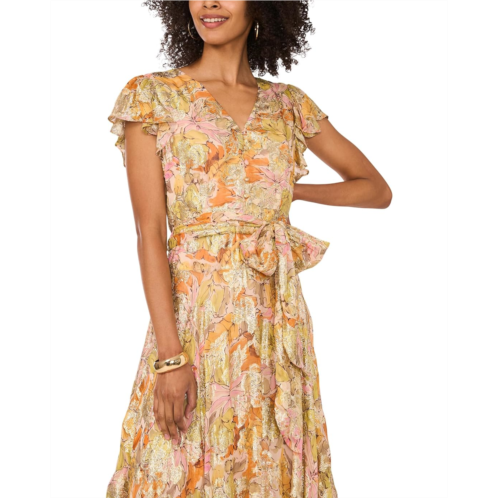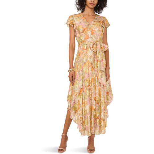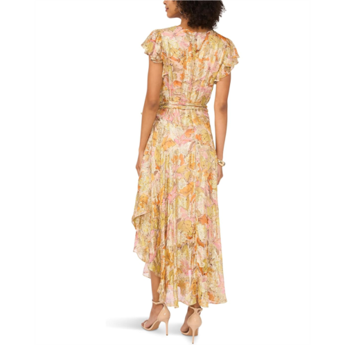 Flow freely and shine brightly wearing the Vince Camuto V Neck Button Down Maxi Dress With Flutter Sleeve. This dress features V-neckline, short flutter sleeves, hidden back-zippered closure, front button-and-loop closure, removable tie belt, partially lined, and asymmetric hem.