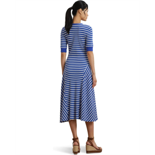 The Lauren Ralph Lauren Striped Waffle-knit Cotton Henley Dress brings refined comfort to everyday dressing. Crafted from a soft, breathable waffle-knit fabric, this dress offers an irresistibly cozy feel while maintaining a structured, flattering fit. The classic Henley neckline with signature 'LRL'-engraved buttons adds a preppy twist, while elbow-length sleeves with ribbed cuffs give it a touch of tailored charm. Designed in a fit-and-flare silhouette that drapes beautifully below the knee, the side skirt panels add movement and grace. With pull-on styling and effortless stripes, this midi dress transitions seamlessly from desk to dinner or errands to evening strolls.