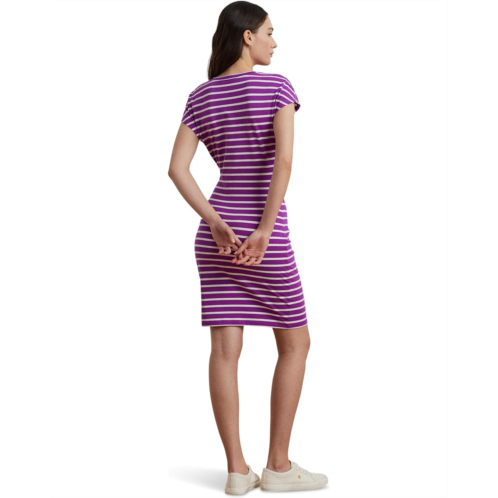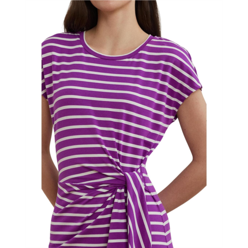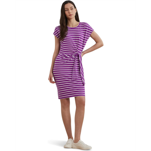 Sail into style with chic stripes wearing the Lauren Ralph Lauren Striped Tie-front Jersey Dress is your go-to piece for casual elegance and everyday confidence. Featuring a flattering slim fit and above-the-knee length, this dress is designed to hug in all the right places. A classic crew neck and short sleeves keep it simple and sophisticated, while the yarn-dyed horizontal stripes add a timeless nautical vibe. The standout tie-front detail at the left waist not only defines your silhouette but adds an on-trend twist. Crafted with pull-on styling for easy wear, it's the perfect mix of comfort and versatility.