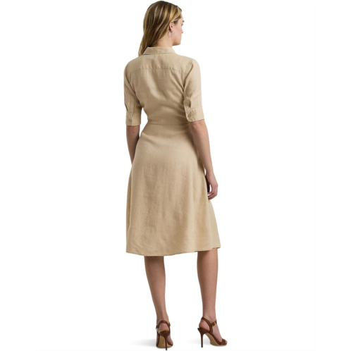 Light-as-air linen brings a breezy look and feel to this iteration of the Lauren Ralph Lauren Tie-Front Linen Shirtdress, while a charming self-tie waist adds to its easy character. It is designed in a fit-and-flare silhouette and hits just below the knee. The self-extended tie on the waist and back yoke offer a flattering fit while the buttoned front closure with 'Lauren Ralph Lauren'-engraved buttons ensures easy wear. This button-down dress is styled with elbow-length sleeves, buttoned barrel cuffs, and a point collar. Make your fashion statement wearing this midi dress.