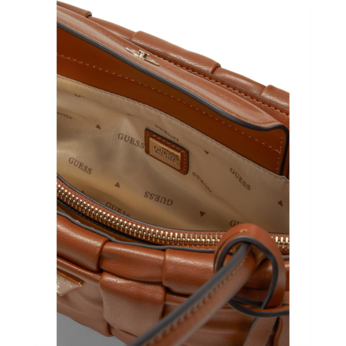 The GUESS Marion Shoulder Satchel is a chic and versatile accessory crafted with polyurethane, offering a stylish blend of textured puff and interwoven design. It features a detachable charm swag for added flair, along with shiny hardware that elevates its polished look. Inside, you'll find two card slips and one zippered pocket for convenient organization.