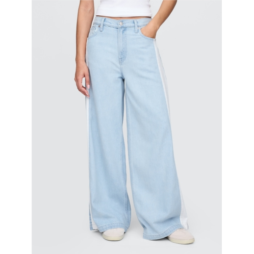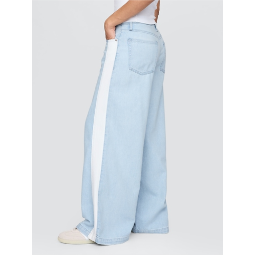 -Look:A five-pocket baggy jean in a light wash with side stripes.