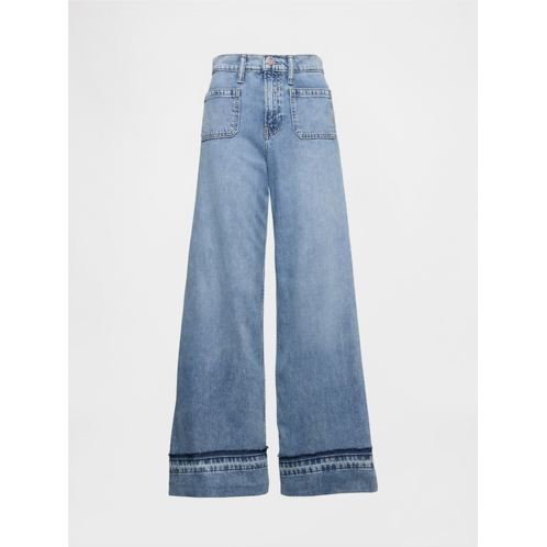 -Details:Zip fly, front & back patch pockets. Pieced hem with raw edge detail.