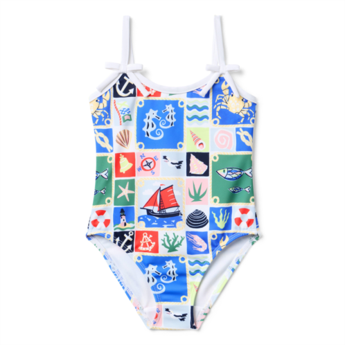 - Make a splash with our nautical print swimsuit. With contrast trim and bow details, plus UPF 50+ sun protection to keep them stylishly safe. Responsibly made with recycled polyester fabric.