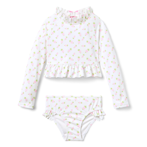 - Pineapple print and ruffles? Our rash guard swimsuit has them covered. Designed with raglan sleeves, a bow at the back and UPF 50+ sun protection to keep them stylishly safe. Responsibly made with recycled polyester fabric.