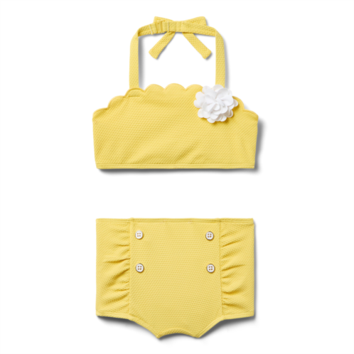 Our textured two-piece swimsuit is a splash of sunshine with a scalloped neck and button details. Finished with a rosette and UPF 50+ sun protection to help keep them stylishly safe. Responsibly made with recycled nylon fabric.
