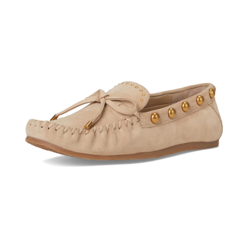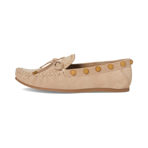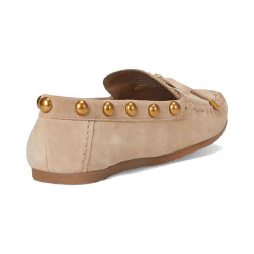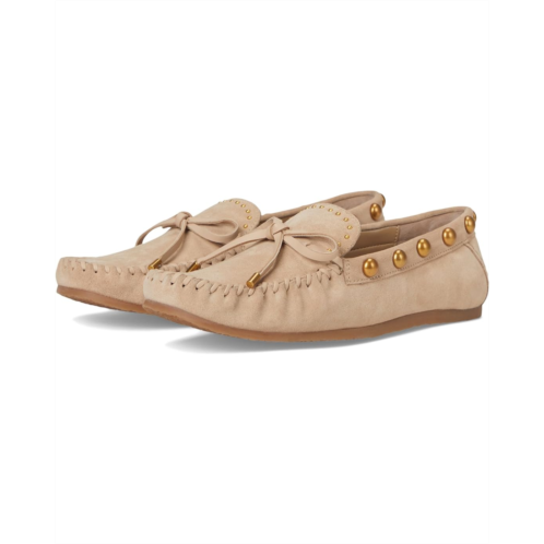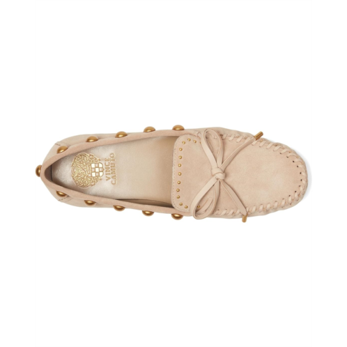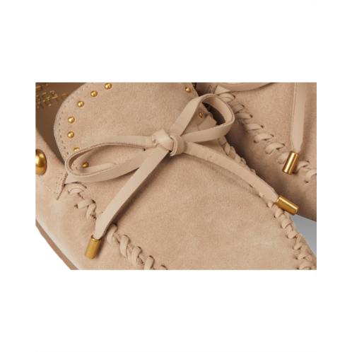 These Vince Camuto Sennett Studded Mocassin loafers blend classic moccasin styling with a bold, modern edge. The soft, suede upper is accented with intricate hand-stitched detailing, while gold-toned stud embellishments along the sides and heel add a touch of glamour. A delicate bow on the vamp enhances the feminine appeal, making these loafers a stylish yet comfortable choice for both casual and sophisticated looks. Perfect for pairing with tailored trousers or relaxed denim.