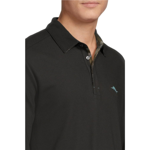 The Tommy Bahama Vintage Vines 5 O'clock Polo blends style and sophistication in a single piece. The pull-on style polo shirt features a self collar with a hidden three-button placket, long sleeves, embroidered marlin logo on the chest, and a straight hem. It also comes with a woven contrast trim inside the collar, placket cuffs, and side seam vents. The moisture wicking, quick drying, UPF 30 fabric makes this apparel perfect for all-day wear.