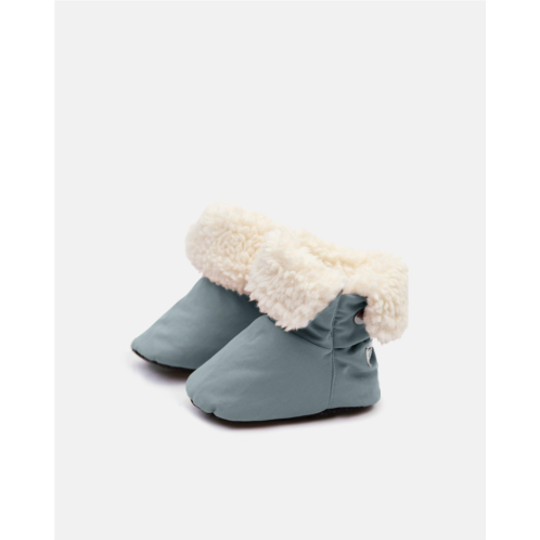 - When it’s really cold outside, tiny feet need big-time booties to stay warm in the winter time. Enter our bootiesdesigned for walkers and pre-walkers featuring the grippy anti-slip soles. The insulation is lightweight, but retains heat thanks to the ultra soft sherpa lining and the 3000MM water repellent outer shell. And they slip on in secondsno tugging necessary. Just pull gently to secure over leggings, dresses, jeans, or tights. Your child can even wear them in their 7AM stroller footmuff on your daily strolls!