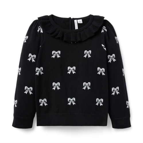 - Bows upon bows for our soft sweater. A ruffle collar adds the perfect finishing touch.