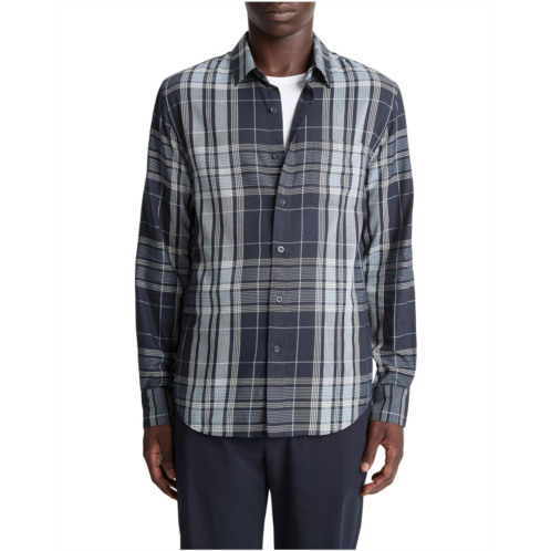 Modern twists on traditional menswear patterns appear throughout the brand's collection this season, which are reflected in the Vince Dunluce Plaid Separate Placket Long Sleeve Shirt in plaid that plays with scale in an oversized check. This classic button-up silhouette is crafted from a lightweight cotton-blend twill fabric for all-day comfort. It is styled with long sleeves, buttoned cuffs, a collared neckline, and a straight hem. This button-down, patterned shirt works for different occasions.