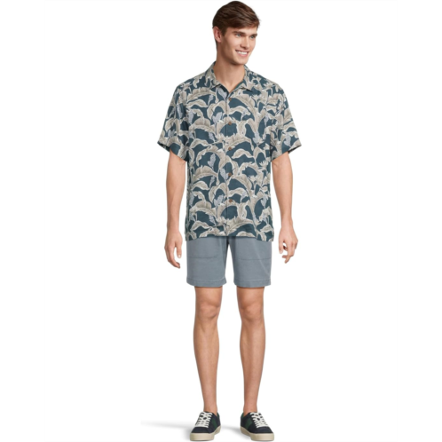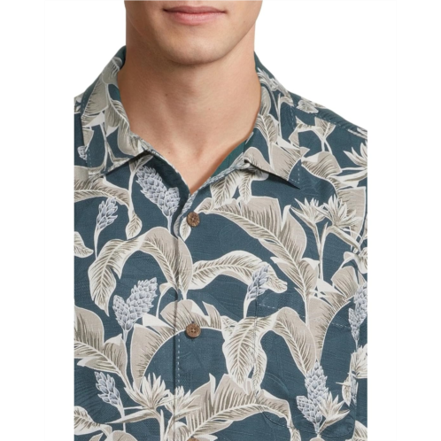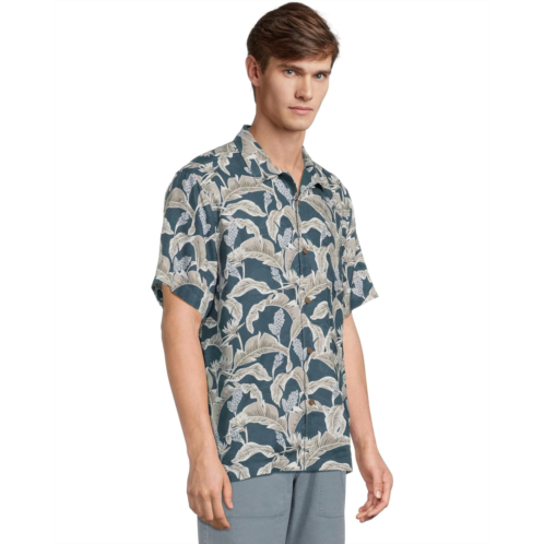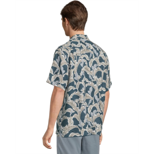 Show off a cool and chic look at the next vacation or casual day out wearing Tommy Bahama Midnight Palms Shirt. This short-sleeve camp shirt is crafted from jacquard silk for a luxurious touch of comfort. It features a traditional camp collar, a slightly curved chest pocket, an allover leafy print, and a standard-length silhouette with a straight hem.