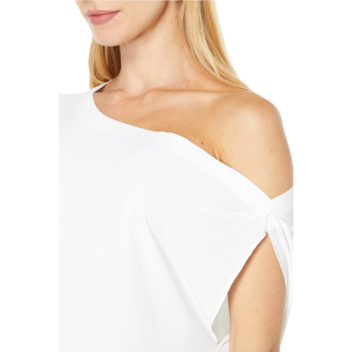 - Asymmetrical one-shoulder shirt in a matte stretch jersey fabrication.