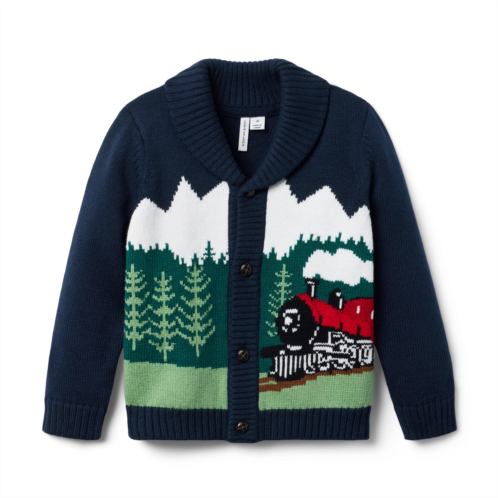 All aboard for festive style in our cozy cardigan. With an intarsia-knit train design and classic shawl collar, it's just right for any occasion.