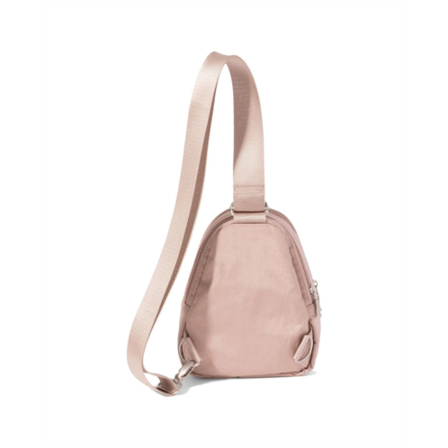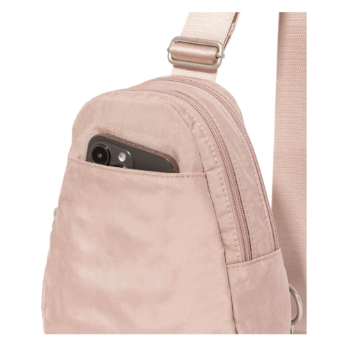 - Designed with an adjustable strap that extends from 26' to 54', the Baggallini Double Zip Mini Sling offers versatile styling. This stylish sling bag can be worn on the left or right side. Easy to carry around, this belt bag comes with a lipstick loop and key leash for added storage and functionality. Get ready for the office or a vacation trip with this chic sling bag.
