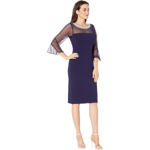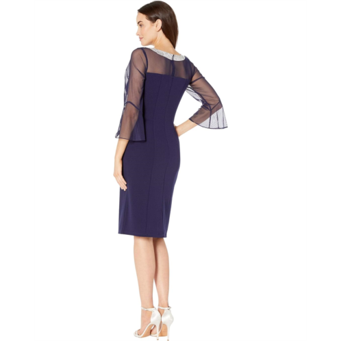 [US] Womens Alex Evenings Short Shift Dress with Beaded Illusion Neckline and Bell Sleeves