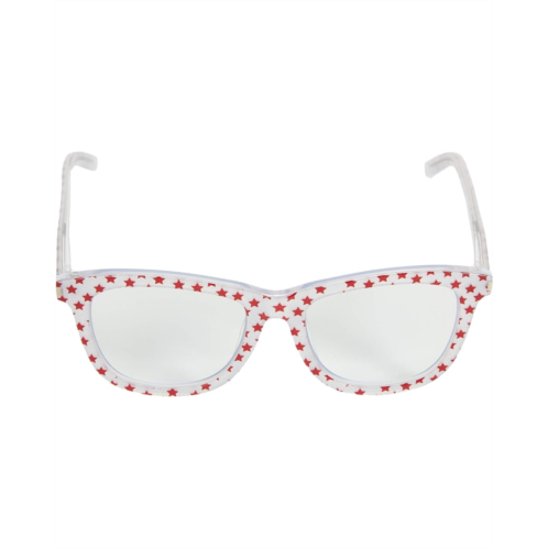 Plastic frames in a square silhouette with plastic arms and ear guards.