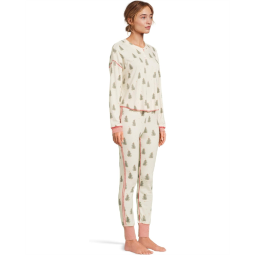 A long sleeve henley crewneck paired with high rise joggers in a stretchy, ribbed jersey fabric. With allover print, you'll be ready for a day of lounging or a restful evening.