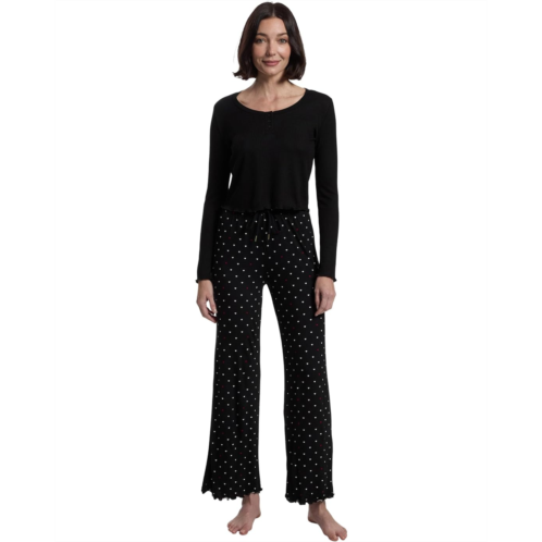 A long sleeve scoop neck top with a Henley neckline in a soft waffle fabric is paired with a super soft jersey wide leg drawstring pant, embellished with sweet lettuce ruffle edges. Perfect for lounging at home!