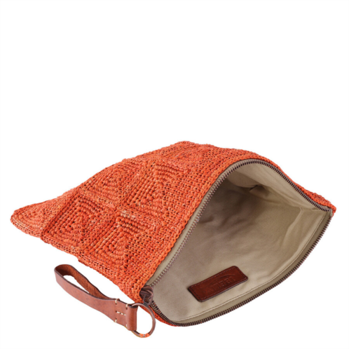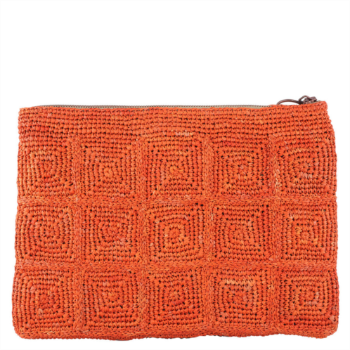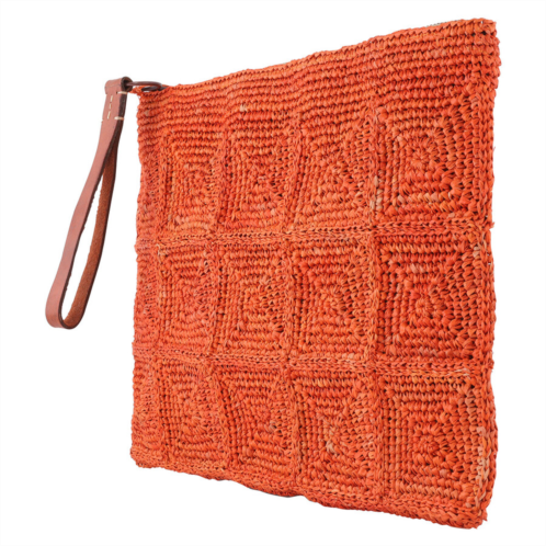 Ibeliv Ladies Clutch. SKU: TANALA. Color: Orange. Ibeliv Tanala Woven Clutch. A timeless piece handcrafted from natural raffia with refined leather trim. The Tanala clutch embodies effortless elegance, featuring a top zip closure, a slim handle, and a cotton-lined interior to keep your essentials secure. Its vibrant pumpkin orange hue adds a chic, artisanal touch to any look. Composition: 100% Raffia (outer); Leather trim; Cotton lining. Dimensions: 11.8' W × 8.3' H × 0.4' D. Handle Drop: 4.3' (30 × 21 × 1 cm approx.) Made in Madagascar.