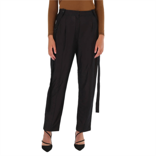 Burberry Ladies Bottoms. Fashion category - Pants & Leggings. SKU - 4564274. Color - Black. Burberry Black Chiffon And Jersey Tailored Trousers With Strap Detail. This tailored trousers from Burberry featuring a high waist, hook-and-bar and zip fly closure, buffalo horn buttons, double pleat detail, exaggerated buttoned straps, buttoned side pockets and buttoned rear welt pockets. 72% polyamide, 28% elastane. Made in Italy.