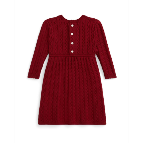- Sweet style meets timeless charm in this adorable Polo Ralph Lauren Kids Cable Cotton Sweater Dress & Bloomer. Designed with a classic fit and crafted from soft combed cotton, this mini cable-knit pattern dress is perfect for keeping little ones cozy and stylish. The crewneck with scalloped trim and long sleeves with scalloped cuffs brings delicate detail, while the bow at the waist adds a playful, picture-ready finish. A four-button placket at the back ensures easy dressing, and the rib-knit hem keeps the look polished. Falling just above the knee, this versatile piece pairs comfort with elegance. To complete the outfit, it comes with a matching bloomer, offering both coverage and cuteness.