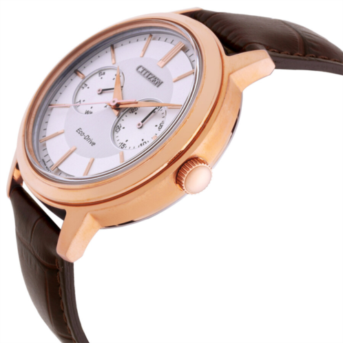 Rose gold-tone stainless steel case with a brown leather strap. Fixed rose gold-tone stainless steel bezel. White, silver dial with rose gold-tone hands and index hour markers. Minute markers around the outer rim. Dial Type: Analog. Two sub-dials displaying: day and 60 minute. Citizen Caliber 8725 eco-drive movement. Scratch resistant mineral crystal. Round case shape, case size: 41 mm, case thickness: 11.2 mm. Buckle clasp. Water resistant at 100 meters / 330 feet. Functions: hour, minute, second. Sport watch style. Watch label: Japan Movt. Citizen Men's Watch BU4032-11A.