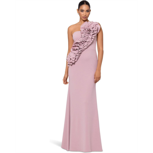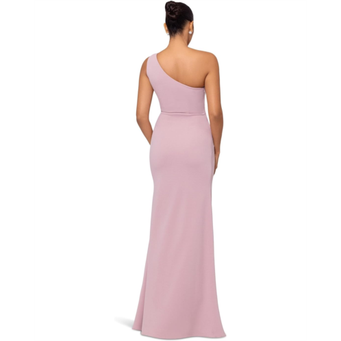 - Ignite your allure with the 'Gianina' Betsy & Adam Long Scuba Crepe 3D Flower Dress. This one-shoulder masterpiece boasts a hidden back zipper, ensuring a flawless fit. Fully lined, the dress flaunts a wrap skirt for added allure. The enchanting 3D flower detail radiates romance, making it perfect for special occasions.