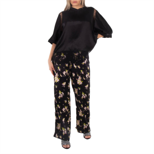 Burberry Ladies Bottoms. Fashion category - Pants & Leggings. SKU - 8072499. Color - Black Ip Pat. Burberry Ladies Jane Floral Print Trousers. These Burberry trousers feature a striking black base adorned with a delicate floral print in shades of green and white. The wide-leg silhouette and sharp pleats provide a sophisticated and modern fit. It features a zip fly, belt loops and a hook-and-bar fastening. Material - Silk;Cotton.