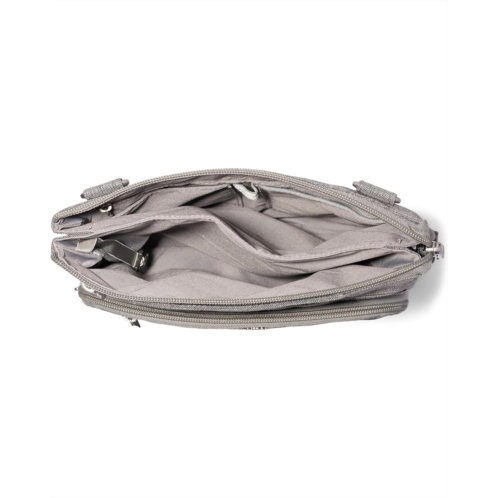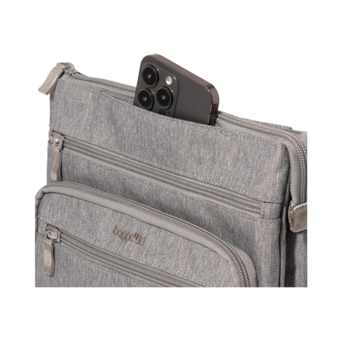 - Looking for a crossbody bag with a little more organization? This Baggallini Out and About Crossbody Bag is it. Designed with two divided interior compartments, including a secret privacy pocket, say goodbye to fumbling around for that lip balm or cash. Plus, with a front pocket designed with RFID-protected slots, tuck away your cards without worry. Crafted with high-quality nylon fabric, the crossbody features a detachable crossbody strap, a zipper closure with eight pockets, key leash, and pen holder for hassle-free organization.