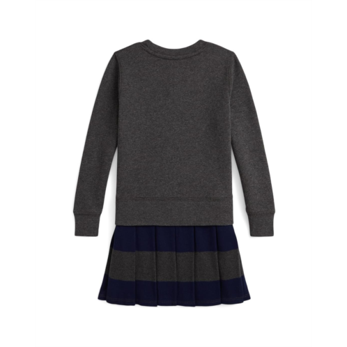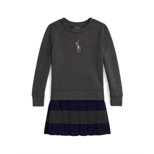 - Part of the season's prep school-inspired concept, this Polo Ralph Lauren Kids Big Pony Fleece Sweatshirt Dress unites a peached fleece bodice with a striped and pleated cotton interlock skirt. Our multicolored Big Pony adds an iconic Polo finish. It features a crew neckline, long sleeves with ribbed cuffs, and a ribbed hem on the bodice. This product is sourced via a system of mass balance and therefore may not contain Better Cotton. Visit bettercotton.org/massbalance for more information about mass balance.