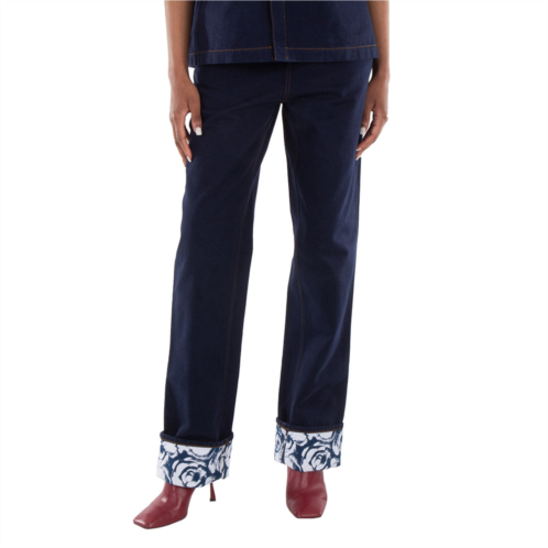 Burberry Ladies Bottoms. Fashion category - Jeans & Denim. SKU - 8080778. Color - Indigo Blue. Burberry Contrast Cuff Boyfriend Denim Trousers. These denim jeans showcase a contrast cuff design and waistband, complemented by belt loops and back patch pockets. 100% Cotton. Made in Italy.