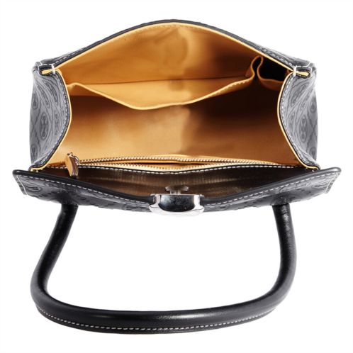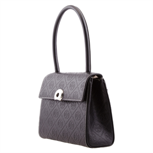 Tory Burch Ladies Shoulder Bag. SKU: 164307-001. Color: Black. Tory Burch Small Deville Bag. Crafted from premium leather by an LWG-certified tannery, the Small Deville Bag features a structured silhouette with Double T debossing, sculptural hardware, and a top handle. Compact yet functional, it includes multiple interior and exterior pockets and a turn-lock flap closure. Dimensions: 8.9' L x 6.9' H x 3.2' D Handle Drop: 6.7' Material: Leather with napa lining.