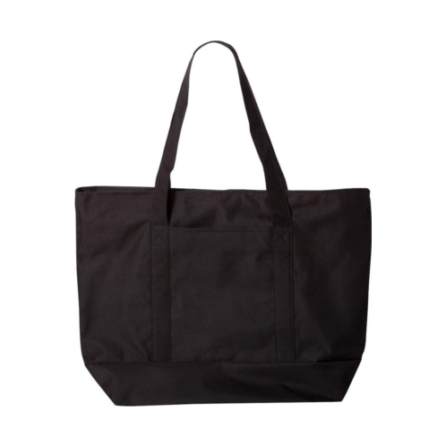 600D polyester. Made with 50% recycled material. Contrasting handles and bottom. Top zipper closure. Self-fabric handles with reinforced box stitching. Internal zipper pocket with key hook. 25 1/2' handle.