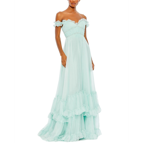 Elevate your evening look with the exquisite Mac Duggal Ruffle Tiered Babydoll Flowy Gown. This stunning dress features an off the shoulder, sleeveless design with a flirty mint color/pattern. The elegant tiered ruffles flow beautifully to approximately 60 inches from shoulder to hem, creating a chic and feminine silhouette. Made from 100% polyester, this gown also includes a concealed back zipper for easy wear. Perfect for special occasions, weddings, prom, or any formal event, this imported gown should be spot cleaned only to maintain its pristine quality. Make a statement in this show-stopping Mac Duggal dress that is sure to turn heads wherever you go.