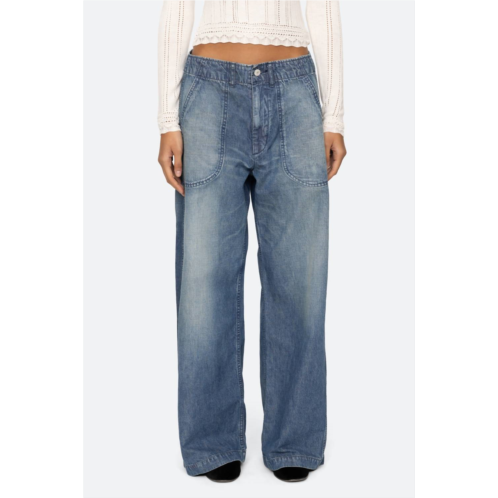 These must-have jeans are fit to perfection.Introducing SEA's Amari Jeans, a chic addition to any wardrobe in a solid blue wash. Crafted from 100% cotton, these jeans are designed for a relaxed fit with a low-rise, low-slung cut, and feature a straight leg style. Proudly made in India, the button closure adds a classic touch while the presence of pockets ensures added convenience. Care instructions include machine washing for easy maintenance.