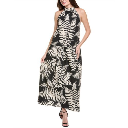 Introducing the Flora Bea NYC Eleana Maxi Dress in Black Windswept Way. This stunning halter neck dress features a scarf neck design and a tie-back closure for a chic and sophisticated look. Made from 100% cotton, this dress is both comfortable and stylish. The Eleana Maxi Dress measures approximately 57 inches from shoulder to hem and is available in sizes small. Machine washable for easy care and imported for quality craftsmanship. Elevate your wardrobe with the Flora Bea NYC Eleana Maxi Dress.
