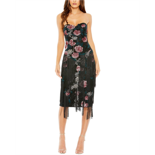 [US] Mac Duggal floral-embossed fringed strapless midi dress