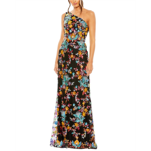 Introducing the stunning 'Mac Duggal One-Shoulder Gown' in Black Multi. This elegant gown features a lace-up back and one-shoulder design, perfect for making a statement at any special occasion. Made from 100% polyester, this gown is approximately 60 inches from shoulder to hem and includes a center back zip for easy wear. Spot clean only. Imported. Please note that measurements are taken from a size 2 and may vary slightly by size. Elevate your wardrobe with this unforgettable piece from the renowned brand, Mac Duggal.