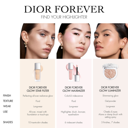 What it is:Dior Forever Glow Luminizer Highlighter powder is reinvented with 2 new light-reflecting finishes*. Infused with hyaluronic acid for added hydration.
