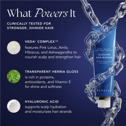 What Else You Need to Know: Powered by RANAVAT’s proprietary Veda4 Bond Strengthening Complex and a potent blend of transparent henna gloss, hyaluronic acid, and moringa seed oil, this masque hydrates dull, brittle, and damaged hair to deliver shine while strengthening and improving manageability.