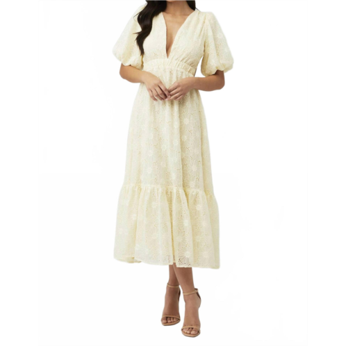 A midi dress so versatile, your options for wearing it are endless.Unveil a touch of bohemian elegance with the Jaxine Dress by ASTR, a stunning choice for summer vacations. Featuring short bubble sleeves and a deep V-neckline, this yellow dress is beautifully detailed with an eyelet finish. The design boasts a cinched waist and a tiered midi skirt, complemented by an open back with buckled strap detail. Made from 100% Polyester with a 95% Polyester, 5% Elastane lining, it features a zip closure at the back; it is also fully lined and dry clean only.