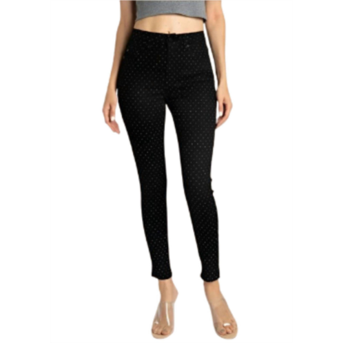 A skinny jean that is both flatering and comfortable. We love this style because it works great with boots, or without! Discover the chic Dotted Skinny Pants by KanCan, crafted for a minimalist yet elegant style. Featuring a subtle polka dot pattern and a sleek zip closure, these pants are designed in a slimming skinny leg and a comfortable mid-rise waist. They feature pockets and an ankle slit, adding a touch of sophistication to your dressy wardrobe. Composition - 66.4% Cotton, 28.3% Polyester, 3.6% Rayon, 1.2% Spandex. Inseam - 27.5 inches. Care - Machine wash and tumble dry.